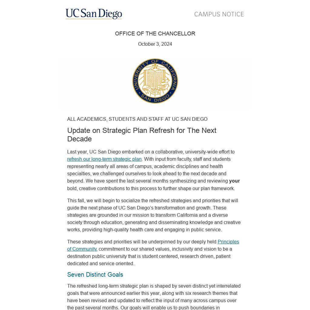 Thank you for your contributions, your creativity and your collaboration to help advance and shape the future of UC San Diego. I look forward to sharing more updates about our strategic planning process and our refreshed strategic plan with you in the coming months.