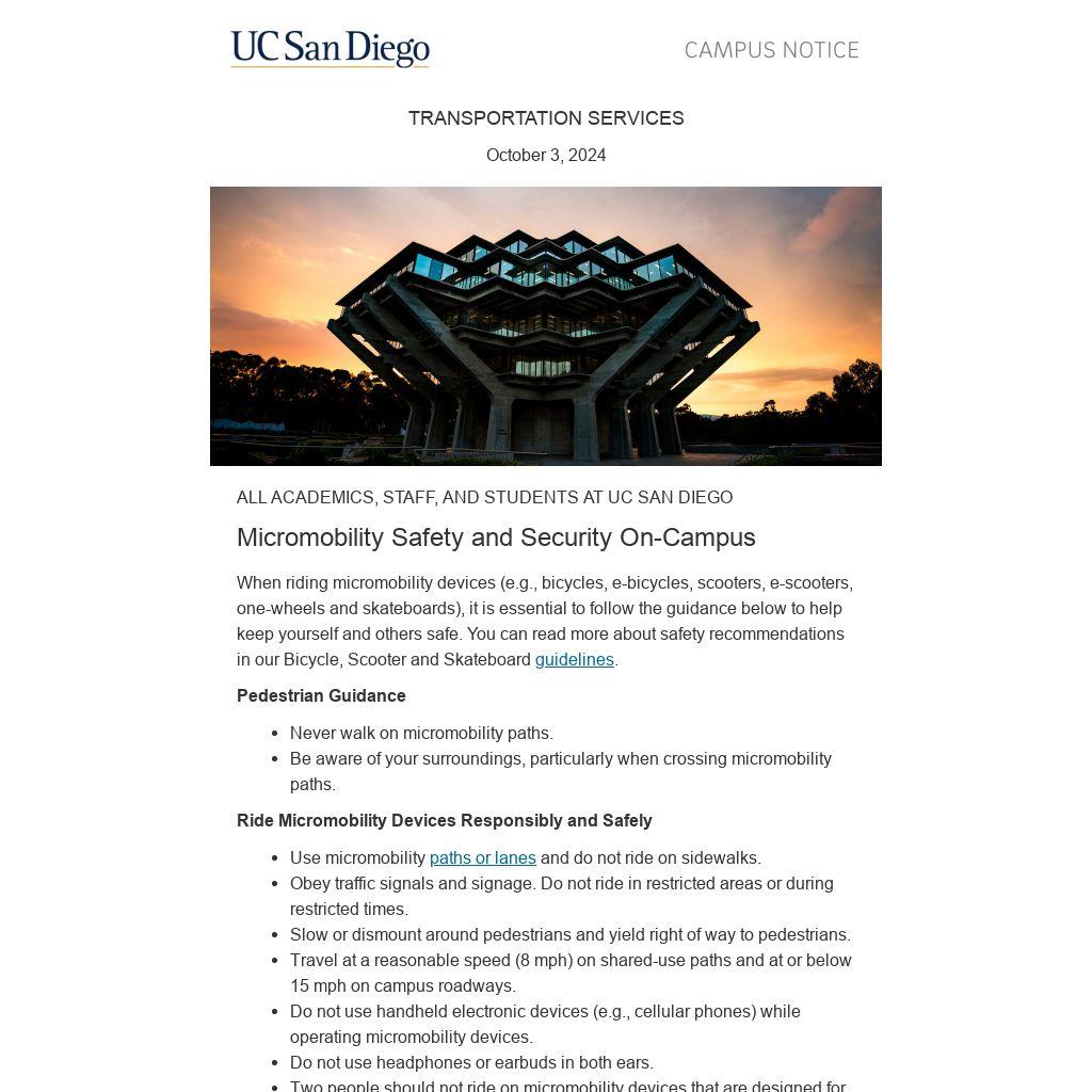 Micromobility devices are subject to the same laws as vehicles on the road, per California Vehicle Codes and campus policy. If these laws, regulations and policies are not followed, you may be subject to citation.