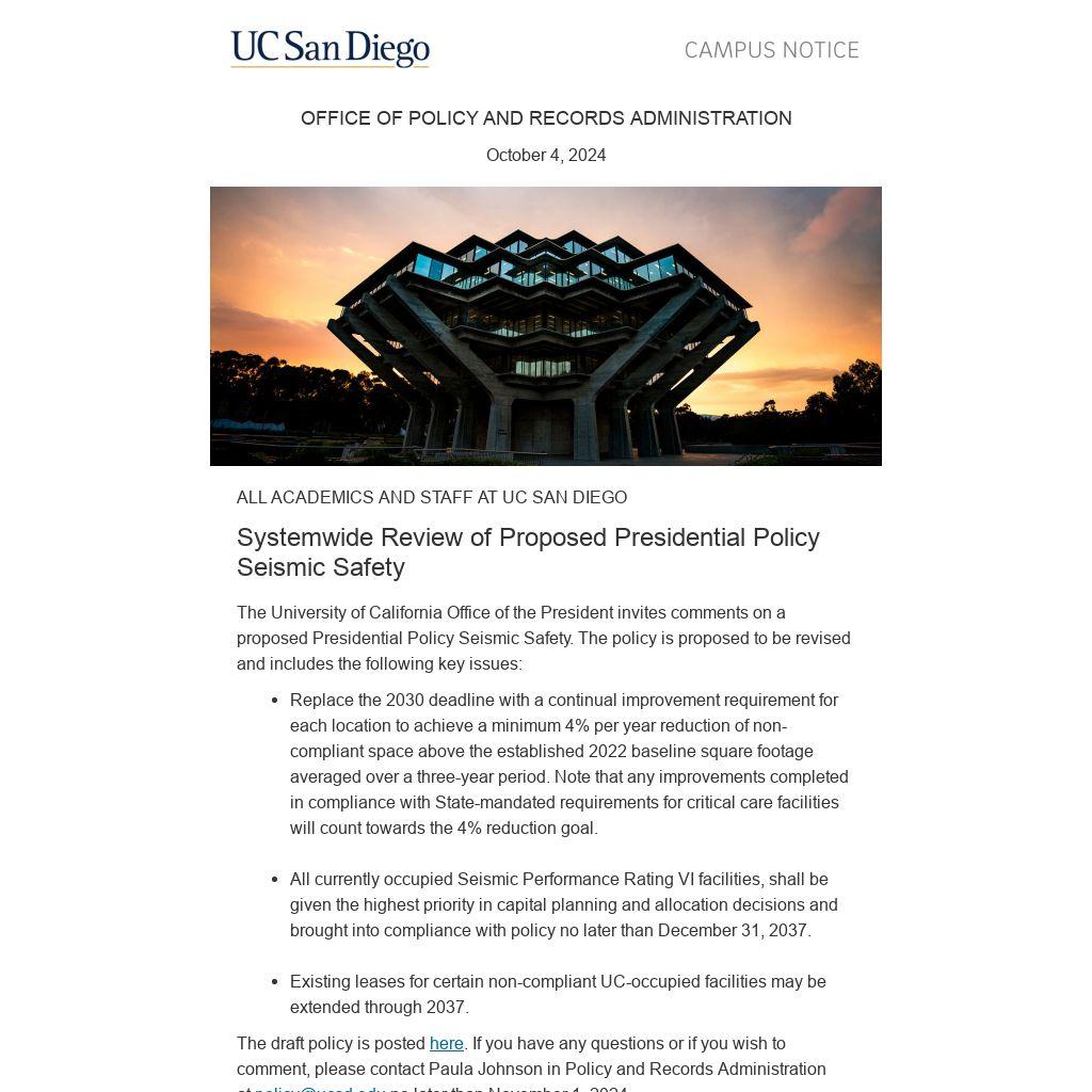 The draft policy is posted here. If you have any questions or if you wish to comment, please contact Paula Johnson in Policy and Records Administration at policy@ucsd.edu no later than November 1, 2024.