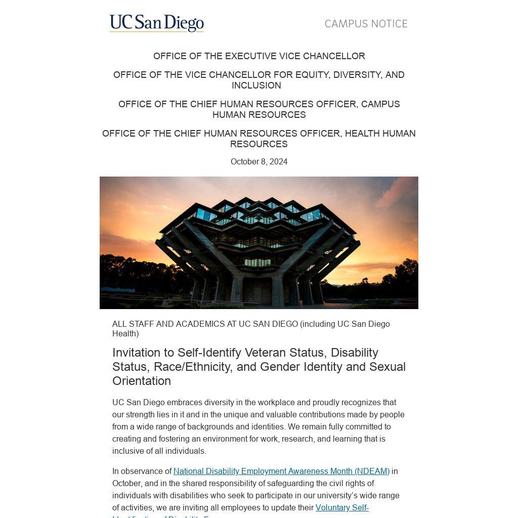 By self-identifying your disability status you are helping UC San Diego uphold our values and advance our commitment to equity, diversity and inclusion. Your assistance in providing this data enables UC San Diego to be precise in our reporting to the federal government and to continue receiving federal funds.