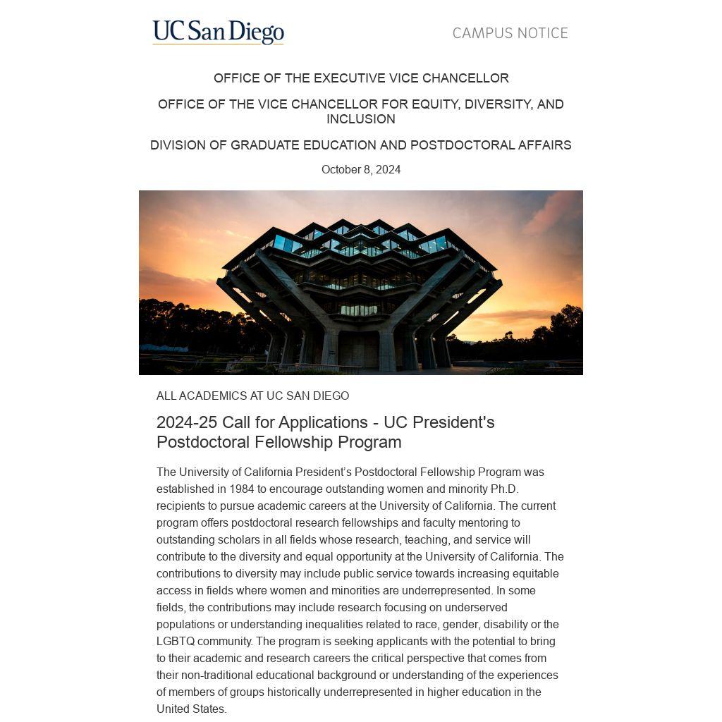 We encourage you to share this opportunity with diverse Ph.D. candidates and early postdocs with potential for a faculty career at the University of California. We also encourage departments to take advantage of the hiring incentive and the opportunity to recruit highly accomplished and UC mentored scholars to our campus.