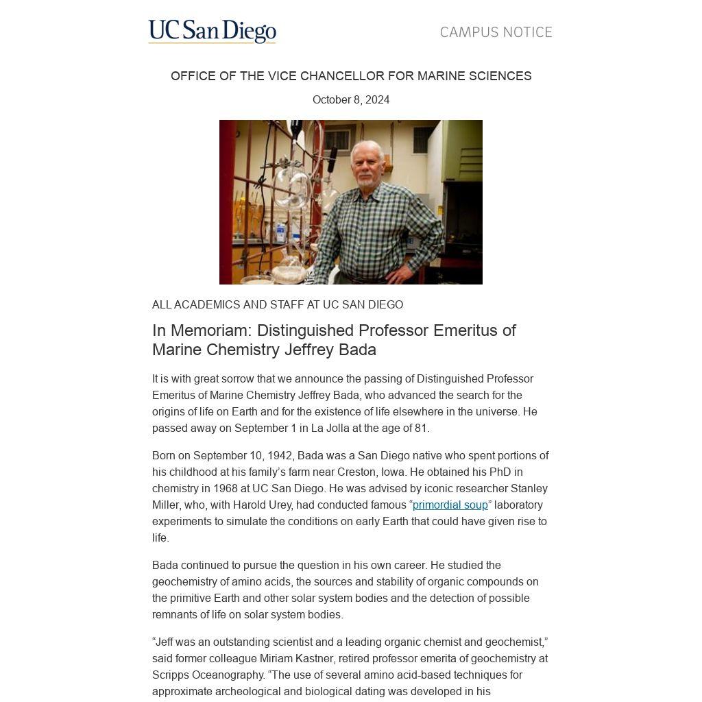 It is with great sorrow that we announce the passing of Distinguished Professor Emeritus of Marine Chemistry Jeffrey Bada, who advanced the search for the origins of life on Earth and for the existence of life elsewhere in the universe. He passed away on September 1 in La Jolla at the age of 81.