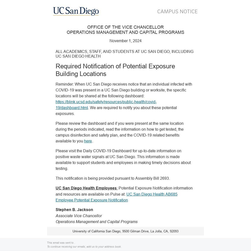 Reminder: When UC San Diego receives notice that an individual infected with COVID‐19 was present in a UC San Diego building or worksite, the specific locations will be shared at the following dashboard: https://blink.ucsd.edu/safety/resources/public-health/covid-19/dashboard.html. We are required to notify you about these potential exposures.
