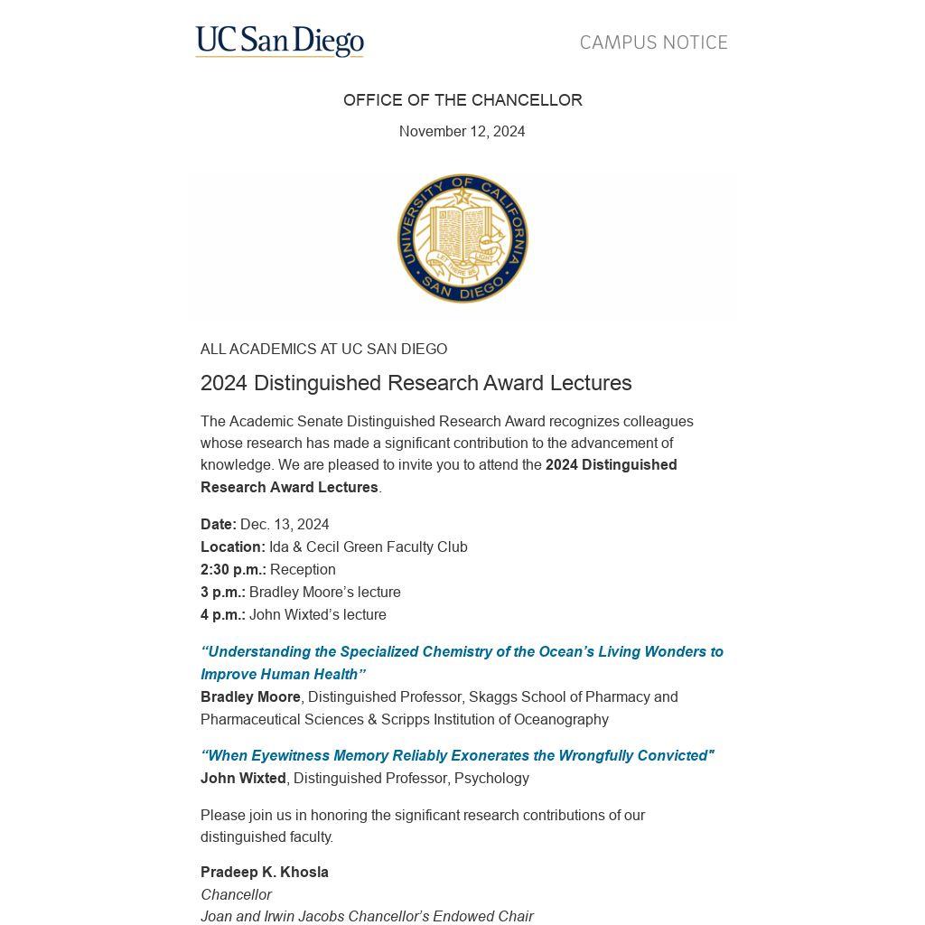 The Academic Senate Distinguished Research Award recognizes colleagues whose research has made a significant contribution to the advancement of knowledge. We are pleased to invite you to attend the 2024 Distinguished Research Award Lectures.