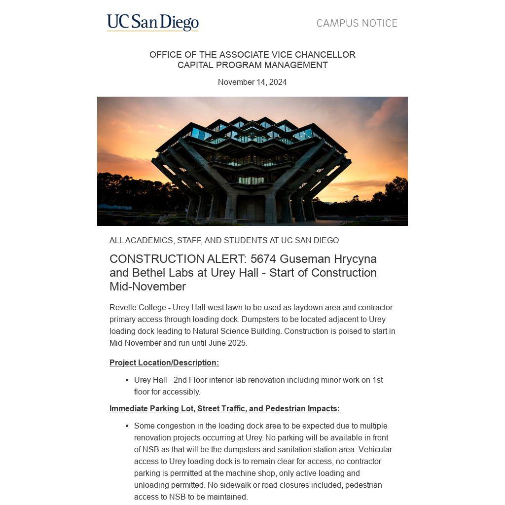 Revelle College - Urey Hall west lawn to be used as laydown area and contractor primary access through loading dock. Dumpsters to be located adjacent to Urey loading dock leading to Natural Science Building. Construction is poised to start in Mid-November and run until June 2025.