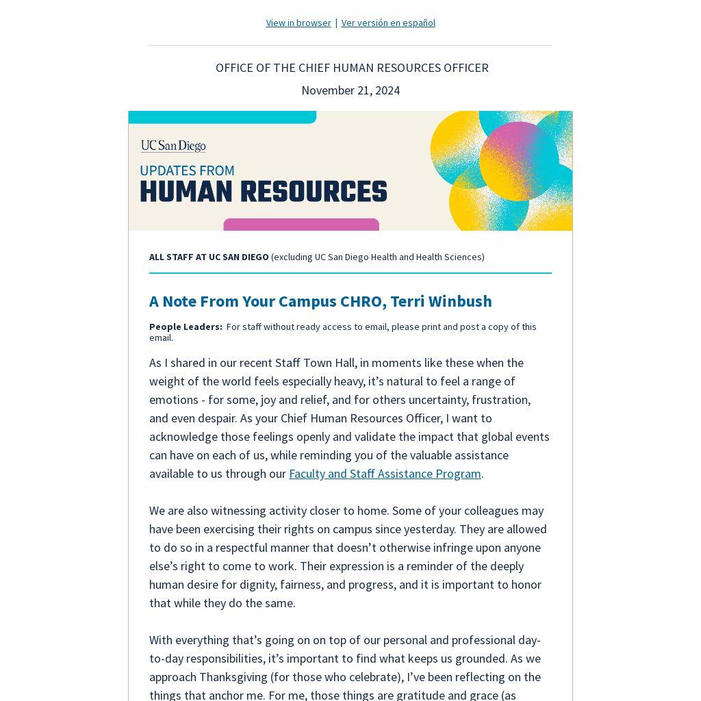As I shared in our recent Staff Town Hall, in moments like these when the weight of the world feels especially heavy, it’s natural to feel a range of emotions - for some, joy and relief, and for others uncertainty, frustration, and even despair. As your Chief Human Resources Officer, I want to acknowledge those feelings openly and validate the impact that global events can have on each of us, while reminding you of the valuable assistance available to us through our Faculty and Staff Assistance Program.