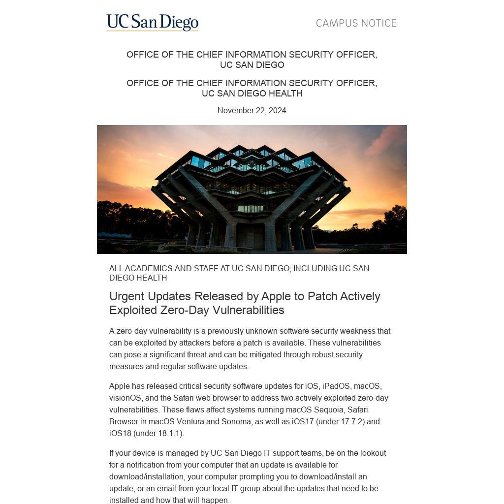 Apple has released critical security software updates for iOS, iPadOS, macOS, visionOS, and the Safari web browser to address two actively exploited zero-day vulnerabilities. These flaws affect systems running macOS Sequoia, Safari Browser in macOS Ventura and Sonoma, as well as iOS17 (under 17.7.2) and iOS18 (under 18.1.1).
