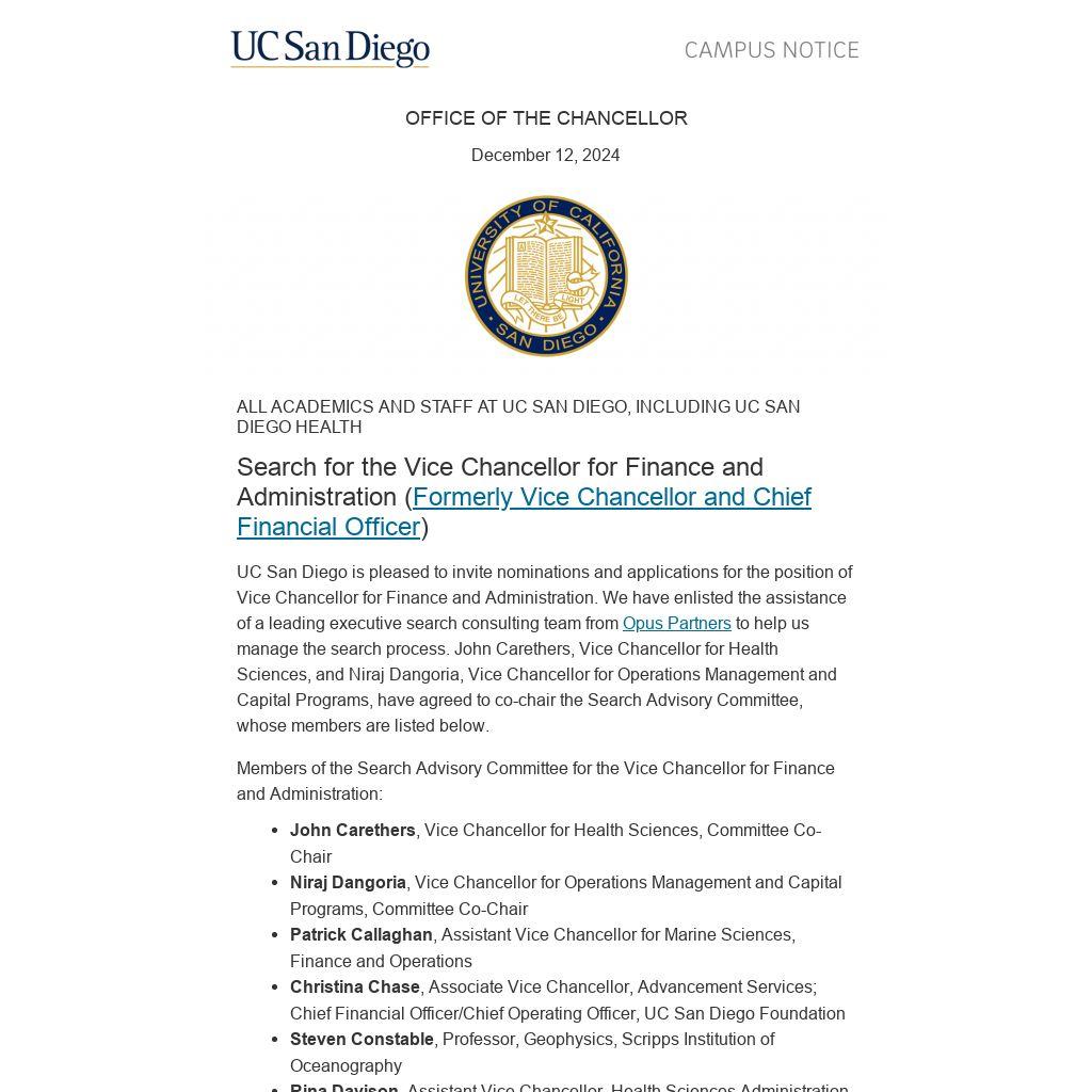 UC San Diego is pleased to invite nominations and applications for the position of Vice Chancellor for Finance and Administration. We have enlisted the assistance of a leading executive search consulting team from Opus Partners to help us manage the search process. John Carethers, Vice Chancellor for Health Sciences, and Niraj Dangoria, Vice Chancellor for Operations Management and Capital Programs, have agreed to co-chair the Search Advisory Committee, whose members are listed below.