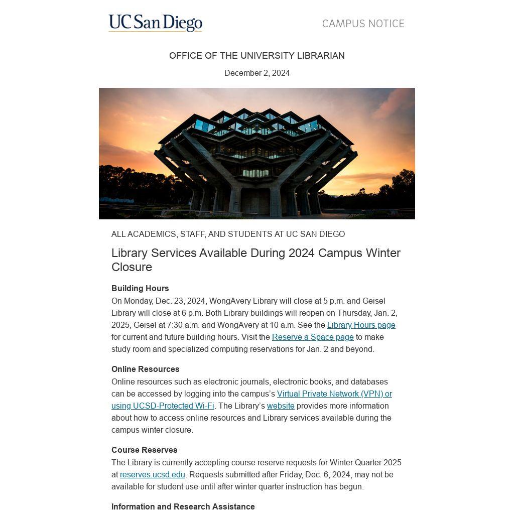 During the holiday closure, limited information and research assistance is available through the Library's 24/7 online chat service, with questions answered by librarians from non-UC libraries. Questions referred to UC San Diego librarians for further response, along with questions submitted by email or phone, will receive replies on Jan. 2, 2025, in the order received. Additionally, the following resources and tools can provide self-help assistance: