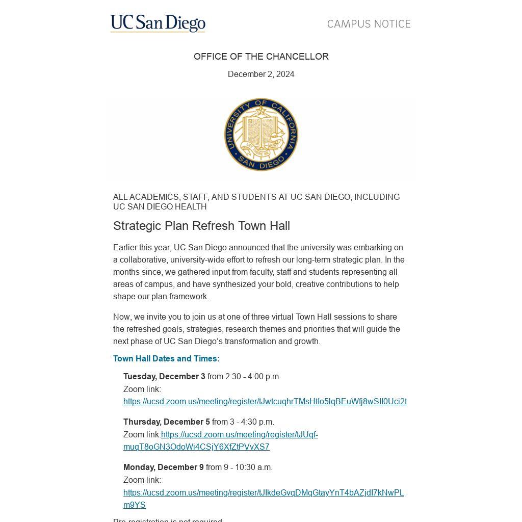 Now, we invite you to join us at one of three virtual Town Hall sessions to share the refreshed goals, strategies, research themes and priorities that will guide the next phase of UC San Diego’s transformation and growth.