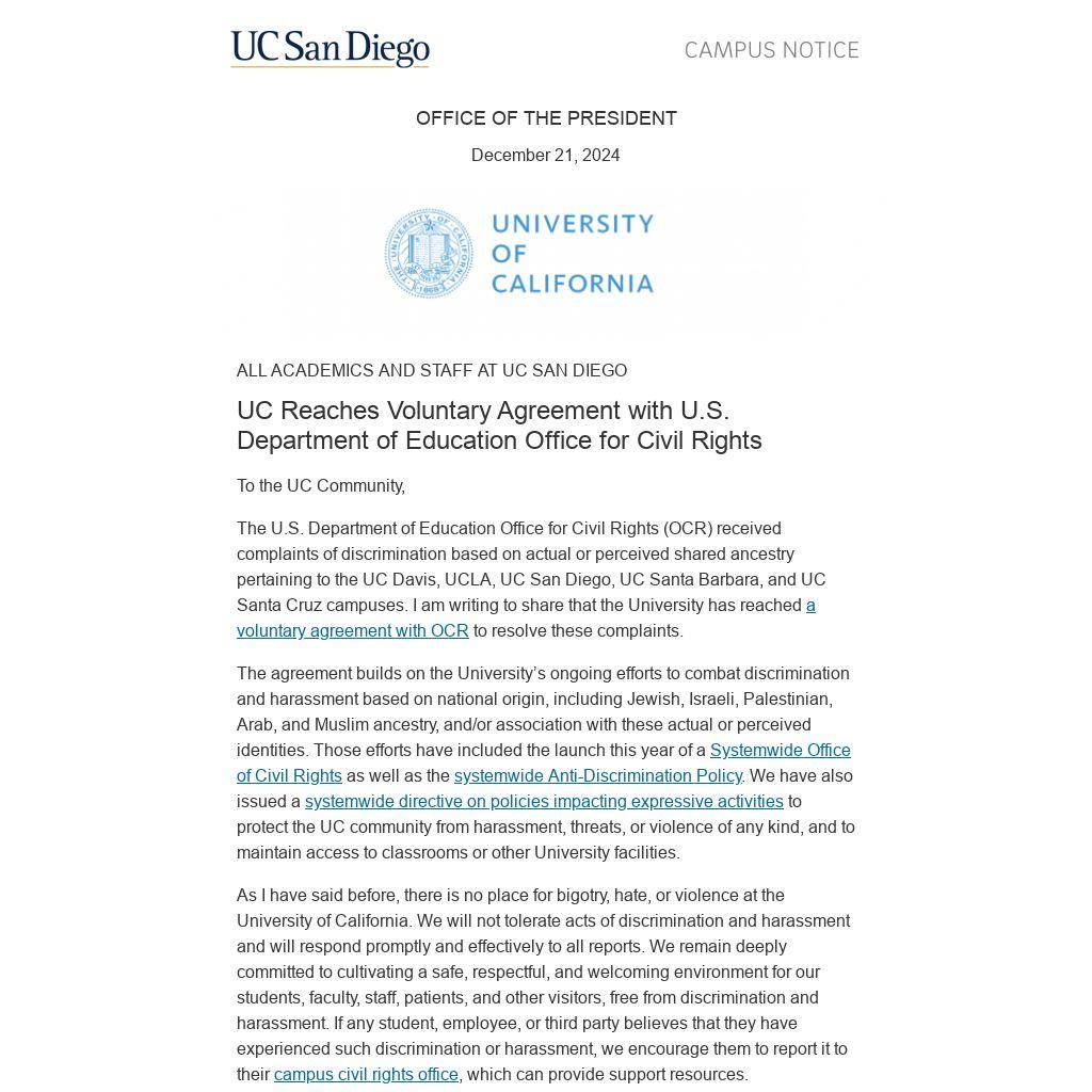The U.S. Department of Education Office for Civil Rights (OCR) received complaints of discrimination based on actual or perceived shared ancestry pertaining to the UC Davis, UCLA, UC San Diego, UC Santa Barbara, and UC Santa Cruz campuses. I am writing to share that the University has reached a voluntary agreement with OCR to resolve these complaints.