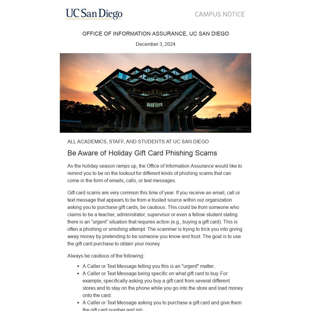 Gift card scams are very common this time of year. If you receive an email, call or text message that appears to be from a trusted source within our organization asking you to purchase gift cards, be cautious. This could be from someone who claims to be a teacher, administrator, supervisor or even a fellow student stating there is an “urgent” situation that requires action (e.g., buying a gift card). This is often a phishing or smishing attempt. The scammer is trying to trick you into giving away money by pretending to be someone you know and trust. The goal is to use the gift card purchase to obtain your money.