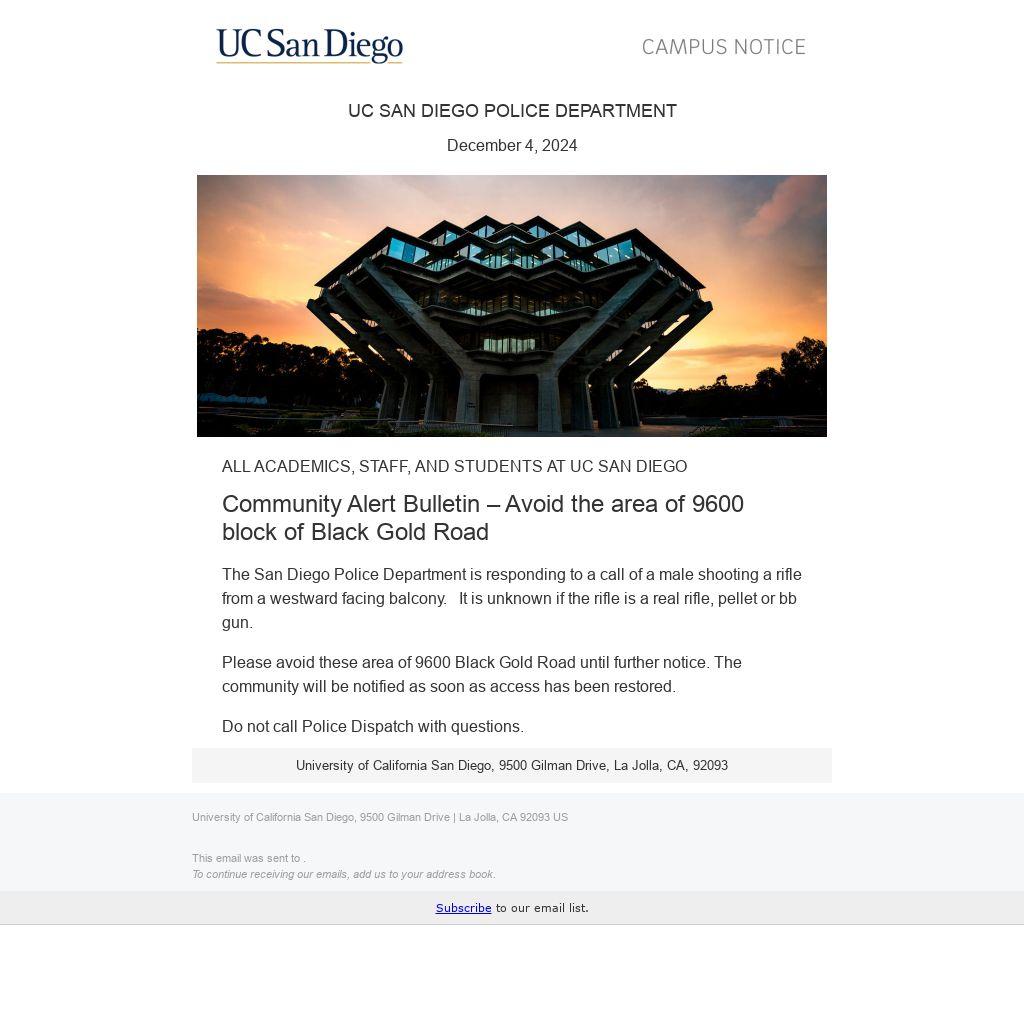 The San Diego Police Department is responding to a call of a male shooting a rifle from a westward facing balcony. It is unknown if the rifle is a real rifle, pellet or bb gun.