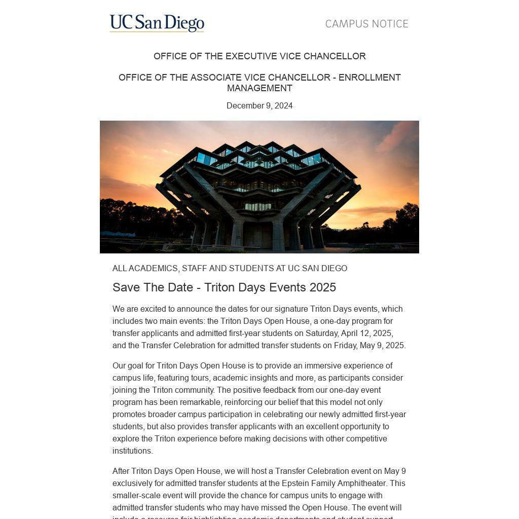 We want to express our sincere gratitude for your ongoing dedication and support for all students, especially our incoming Tritons. We look forward to your participation in welcoming our newest students and making the Triton Days event series an even more memorable experience!