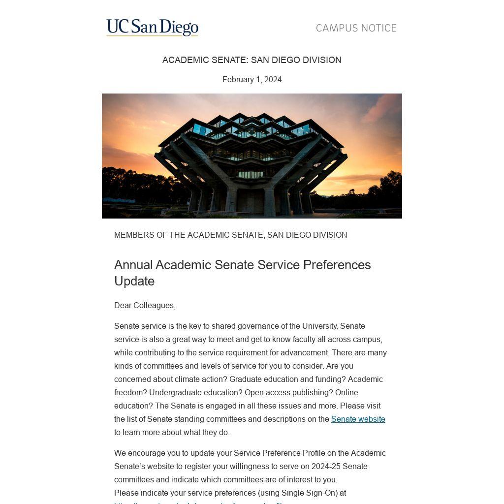 We encourage you to update your Service Preference Profile on the Academic Senate’s website to register your willingness to serve on 2024-25 Senate committees and indicate which committees are of interest to you. Please indicate your service preferences (using Single Sign-On) at https://senext.ucsd.edu/secure/preferences/profile.