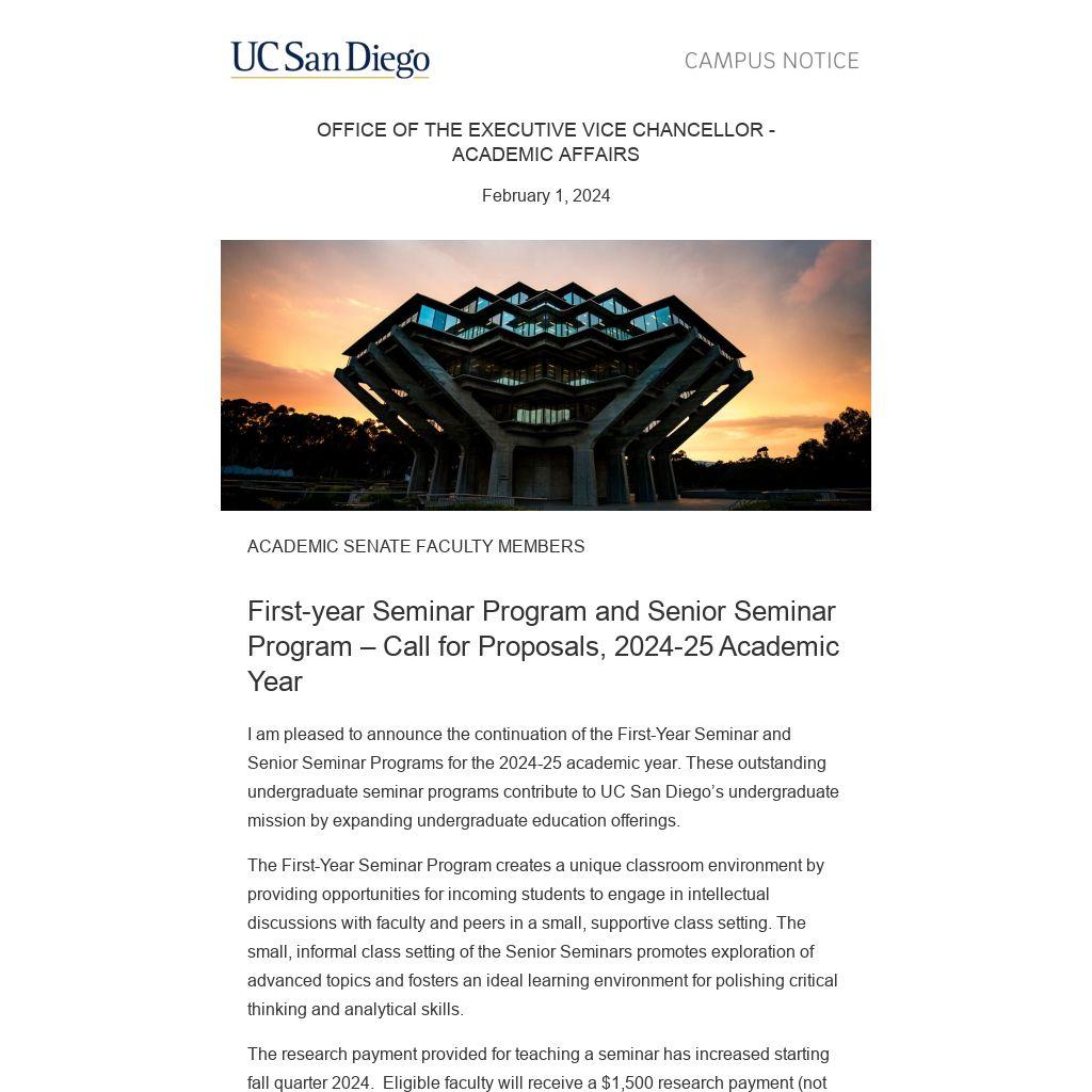 I am pleased to announce the continuation of the First-Year Seminar and Senior Seminar Programs for the 2024-25 academic year. These outstanding undergraduate seminar programs contribute to UC San Diego’s undergraduate mission by expanding undergraduate education offerings.