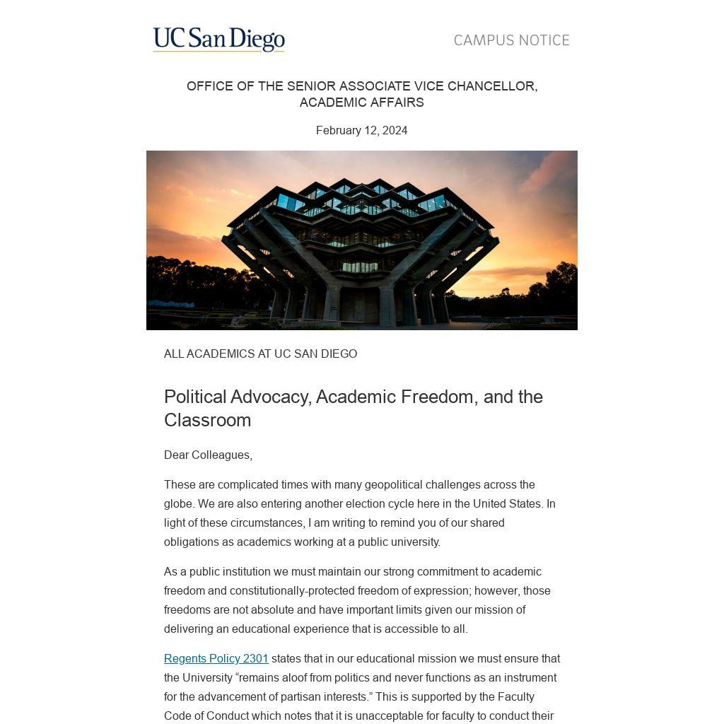 These are complicated times with many geopolitical challenges across the globe. We are also entering another election cycle here in the United States. In light of these circumstances, I am writing to remind you of our shared obligations as academics working at a public university.