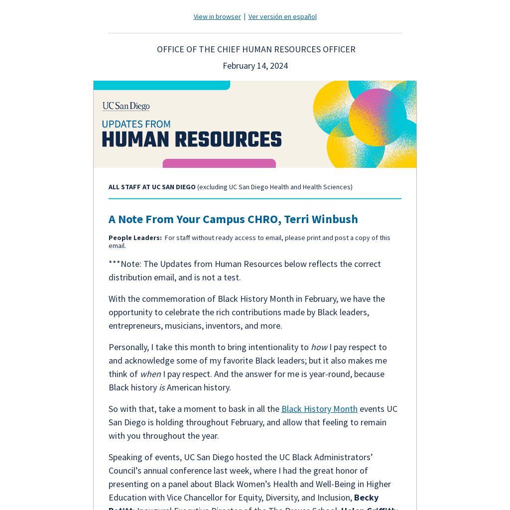 Intended for HR practitioners on campus at UC San Diego, the next HR Forum takes place Mon., March 4 from 1 – 3:30 p.m., and features HR-centric news and updates; a real-time Q&A; and more. Campus HR practitioners at UC San Diego can register and ask questions in advance on Blink.