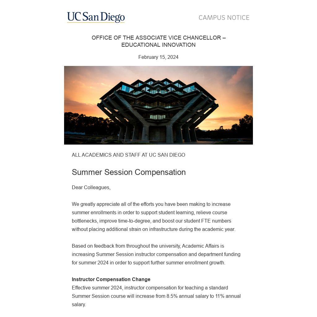 summer 2024, instructor compensation for teaching a standard Summer Session course will increase from 8.5% annual salary to 11% annual salary.