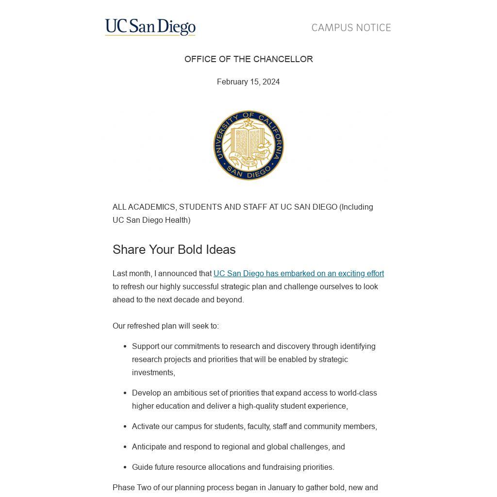Both platforms will close at 5 p.m. on March 1, 2024, so we encourage you to log in and contribute your big, bold ideas for the future of UC San Diego soon.