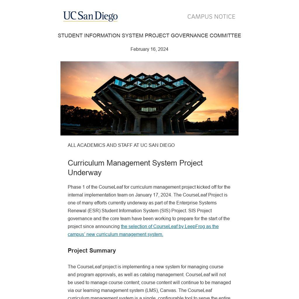 1 of the CourseLeaf for curriculum management project kicked off for the internal implementation team on January 17, 2024. The CourseLeaf Project is one of many efforts currently underway as part of the Enterprise Systems Renewal (ESR) Student Information System (SIS) Project. SIS Project governance and the core team have been working to prepare for the start of the project since announcing the selection of CourseLeaf by LeepFrog as the campus’ new curriculum management system.