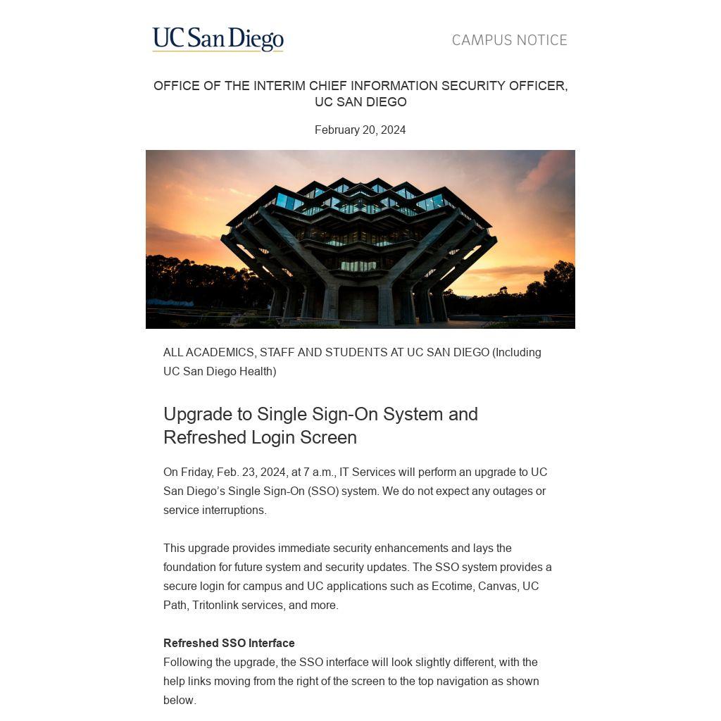 On Friday, Feb. 23, 2024, at 7 a.m., IT Services will perform an upgrade to UC San Diego’s Single Sign-On (SSO) system. We do not expect any outages or service interruptions.