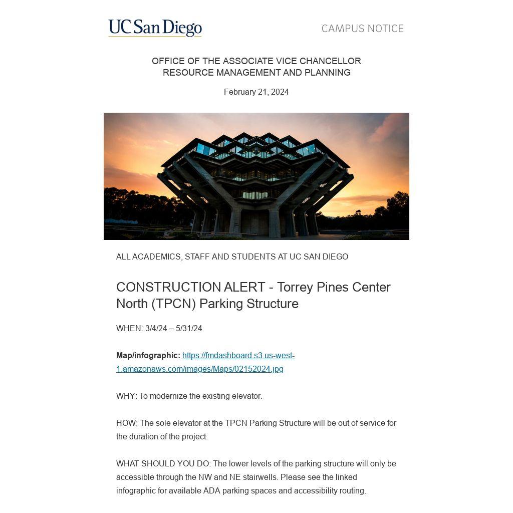 HOW: The sole elevator at the TPCN Parking Structure will be out of service for the duration of the project.
