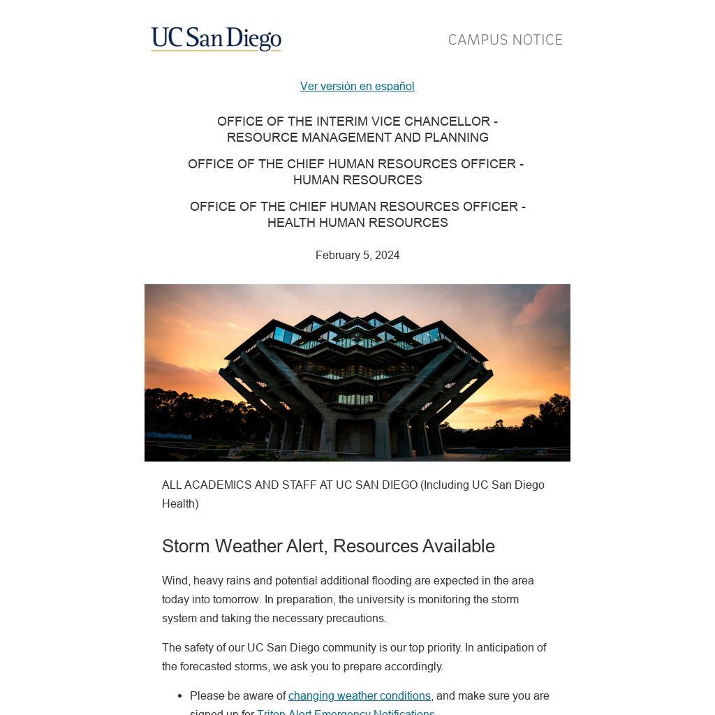 The safety of our UC San Diego community is our top priority. In anticipation of the forecasted storms, we ask you to prepare accordingly.