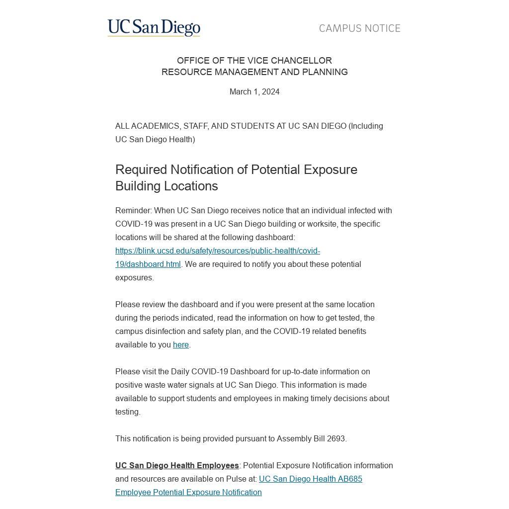 Reminder: When UC San Diego receives notice that an individual infected with COVID‐19 was present in a UC San Diego building or worksite, the specific locations will be shared at the following dashboard: https://blink.ucsd.edu/safety/resources/public-health/covid-19/dashboard.html. We are required to notify you about these potential exposures.