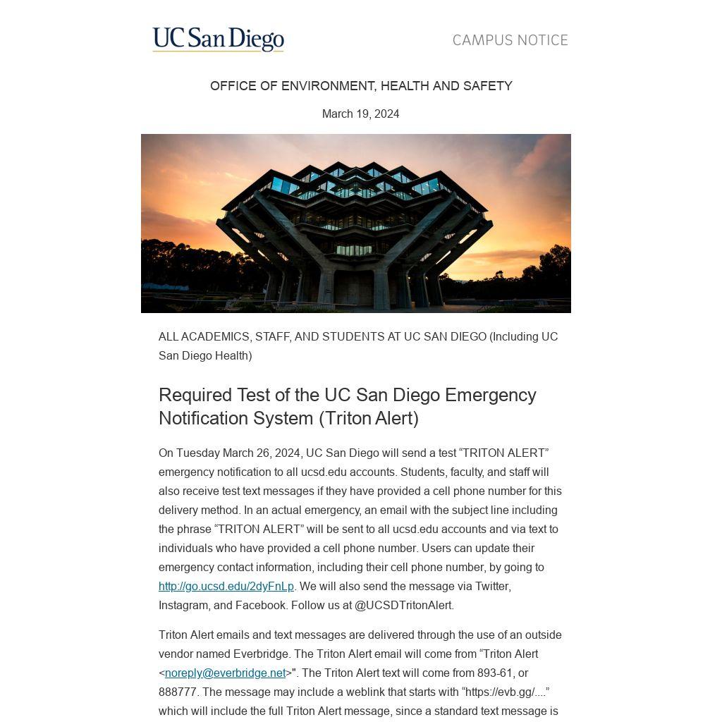 On Tuesday March 26, 2024, UC San Diego will send a test “TRITON ALERT” emergency notification to all ucsd.edu accounts. Students, faculty, and staff will also receive test text messages if they have provided a cell phone number for this delivery method. In an actual emergency, an email with the subject line including the phrase “TRITON ALERT” will be sent to all ucsd.edu accounts and via text to individuals who have provided a cell phone number. Users can update their emergency contact information, including their cell phone number, by going to http://go.ucsd.edu/2dyFnLp. We will also send the message via Twitter, Instagram, and Facebook. Follow us at @UCSDTritonAlert.