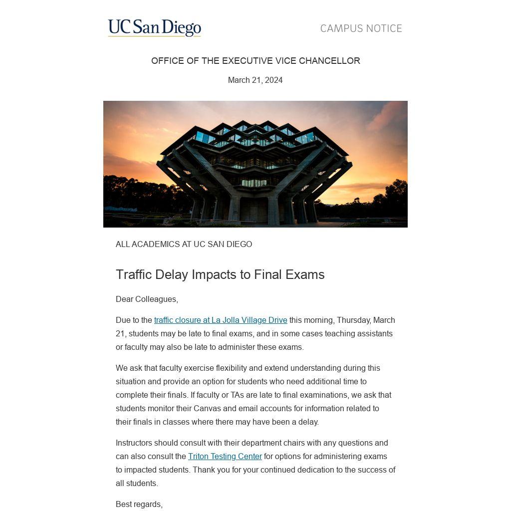 Due to the traffic closure at La Jolla Village Drive this morning, Thursday, March 21, students may be late to final exams, and in some cases teaching assistants or faculty may also be late to administer these exams.