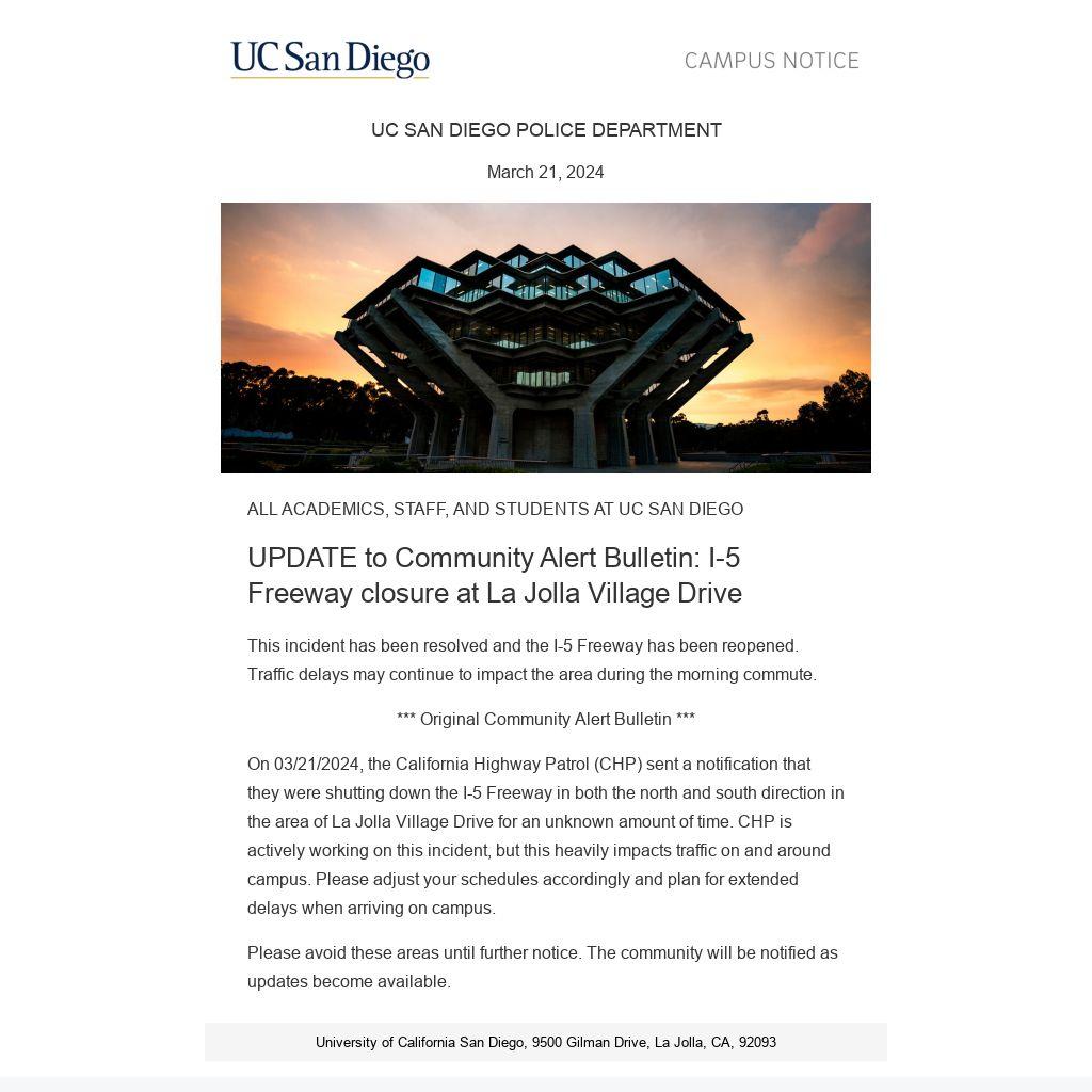 On 03/21/2024, the California Highway Patrol (CHP) sent a notification that they were shutting down the I-5 Freeway in both the north and south direction in the area of La Jolla Village Drive for an unknown amount of time. CHP is actively working on this incident, but this heavily impacts traffic on and around campus. Please adjust your schedules accordingly and plan for extended delays when arriving on campus.