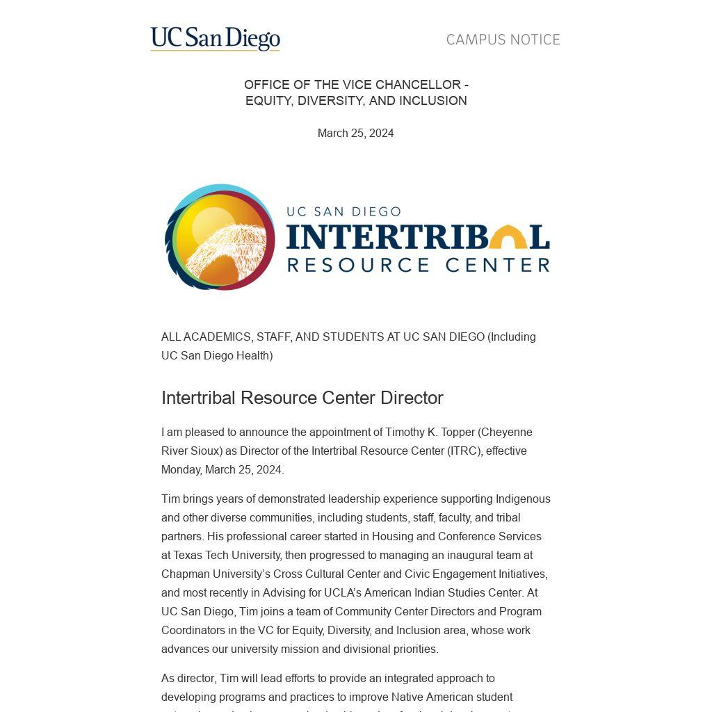 I am pleased to announce the appointment of Timothy K. Topper (Cheyenne River Sioux) as Director of the Intertribal Resource Center (ITRC), effective Monday, March 25, 2024.