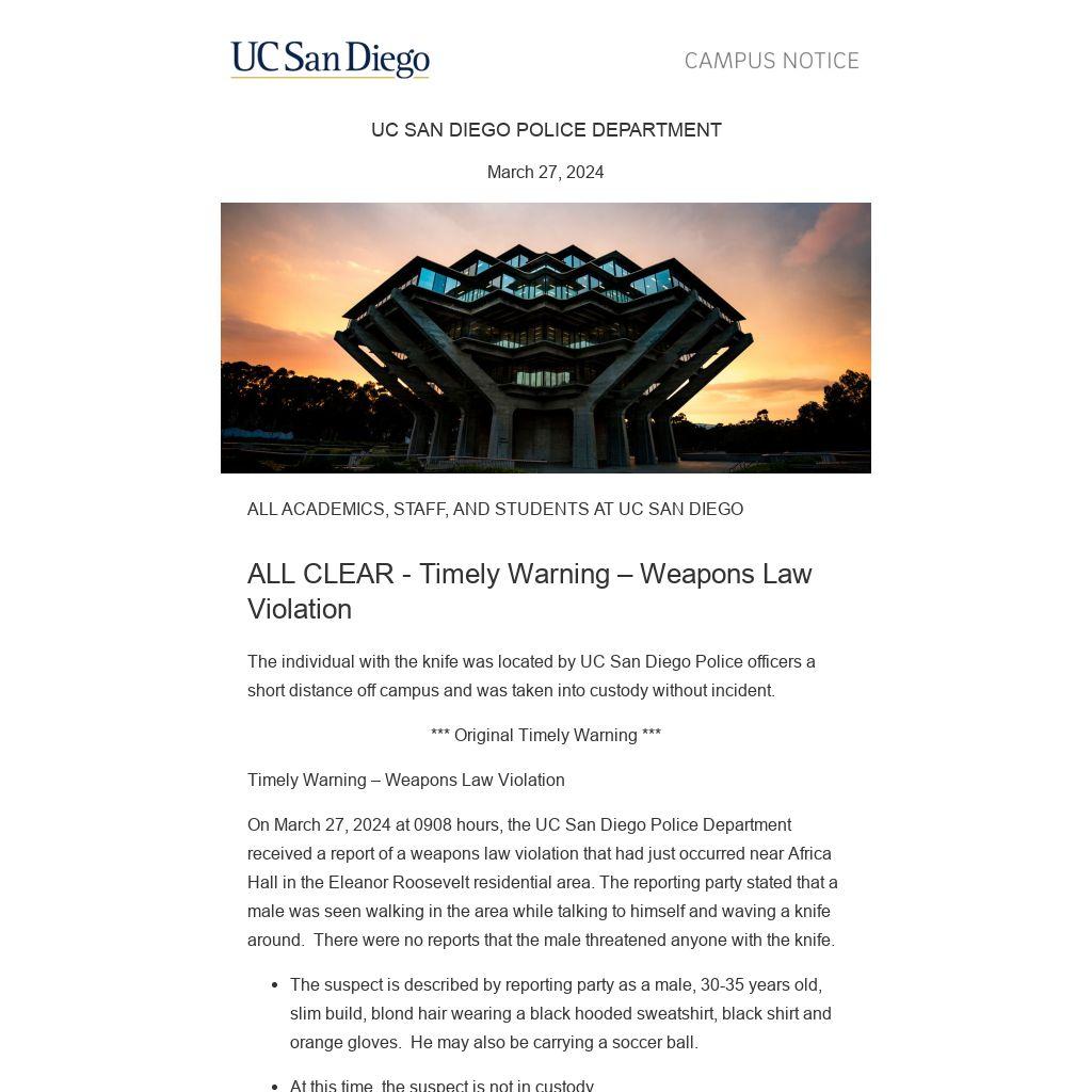 The individual with the knife was located by UC San Diego Police officers a short distance off campus and was taken into custody without incident.
