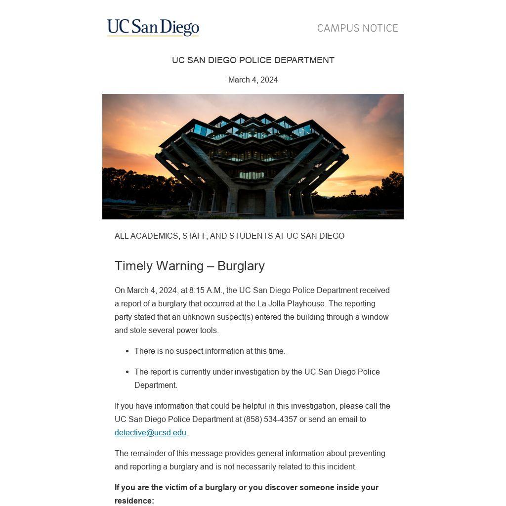 On March 4, 2024, at 8:15 A.M., the UC San Diego Police Department received a report of a burglary that occurred at the La Jolla Playhouse. The reporting party stated that an unknown suspect(s) entered the building through a window and stole several power tools.