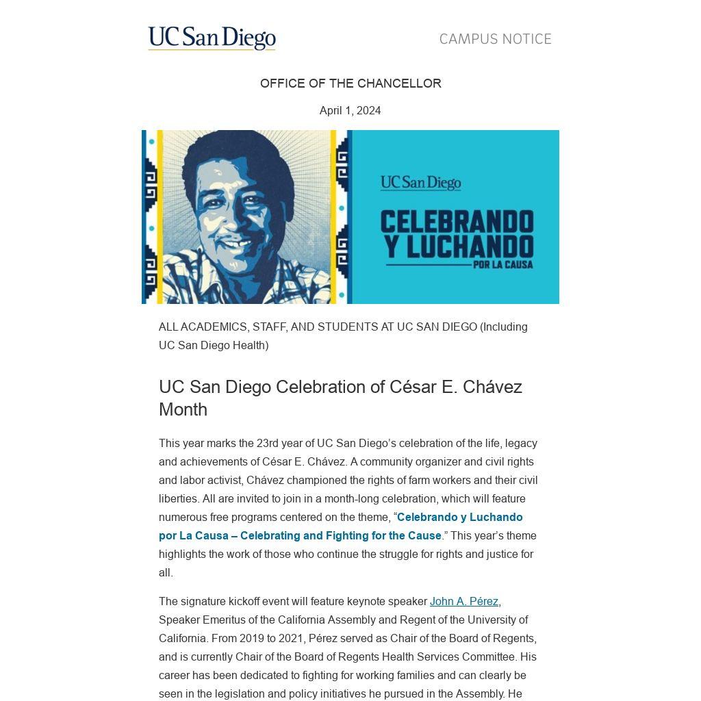 We thank the members of the UC San Diego César E. Chávez Planning Committee for their work to coordinate these educational and celebratory campus activities. Please join us in celebrating the legacy and contributions of César E. Chávez and the Chicanx/Latinx community.