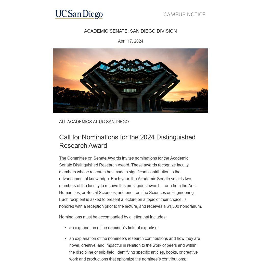 The Committee on Senate Awards is charged with recommending the award recipients to the Representative Assembly. Nomination due date: May 17, 2024. Send to the Committee on Senate Awards via email to Darlene Salmon at desalmon@ucsd.edu. If you have questions, please contact Darlene Salmon at desalmon@ucsd.edu.