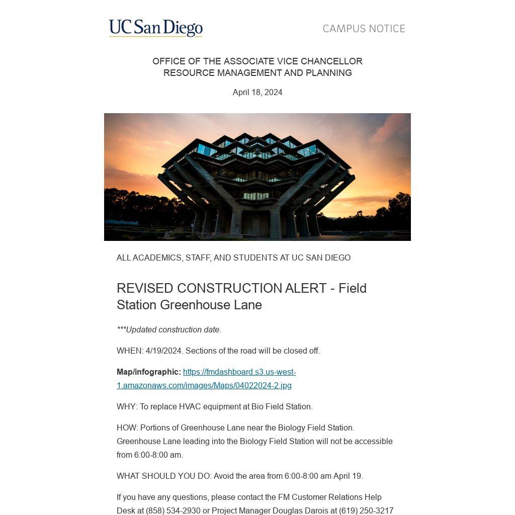 HOW: Portions of Greenhouse Lane near the Biology Field Station. Greenhouse Lane leading into the Biology Field Station will not be accessible from 6:00-8:00 am.