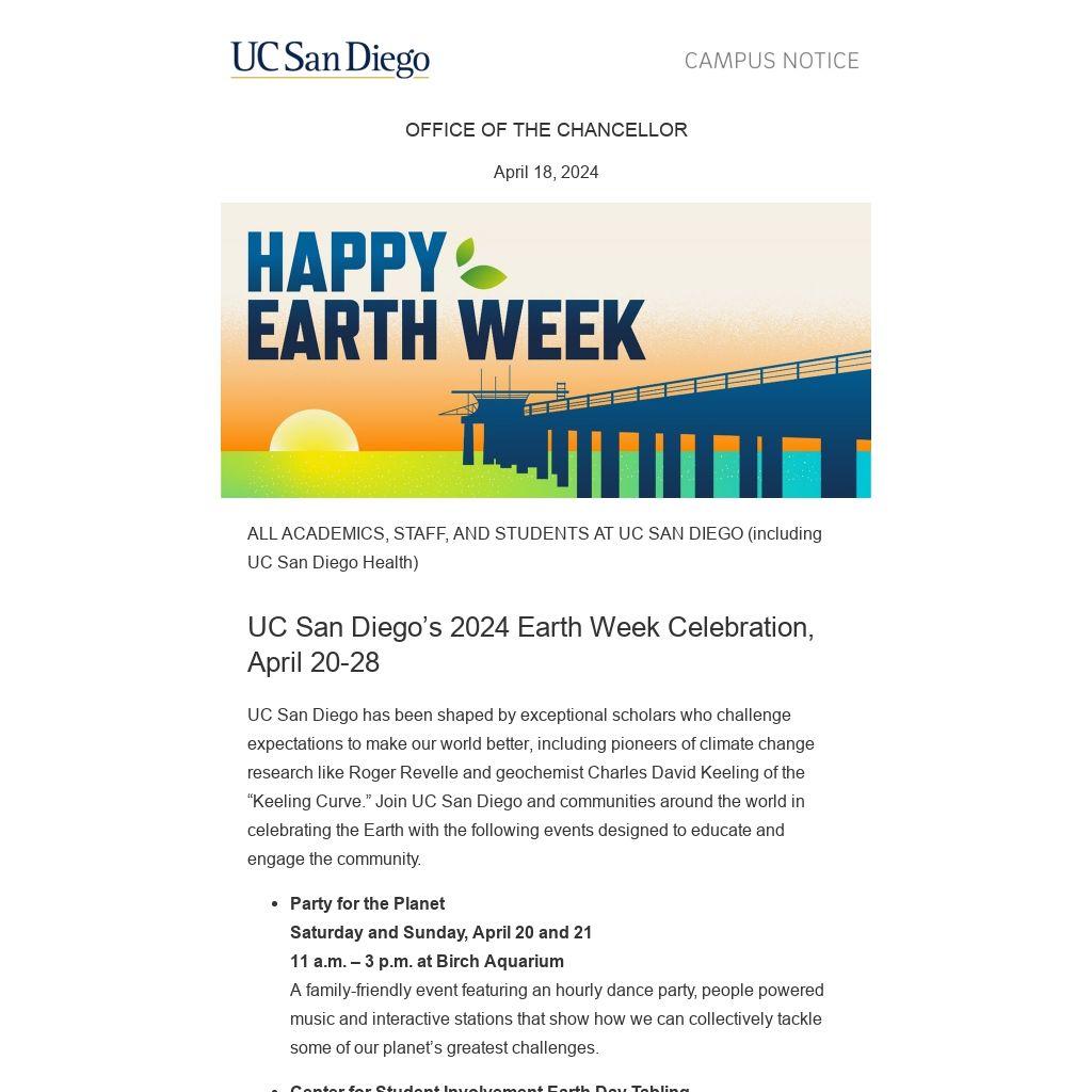 In order to allow employees the opportunity to participate in a UC San Diego Earth Week activity, one hour of administrative leave with pay has been approved. We encourage all managers and supervisors to allow employees to attend, as long as the absence does not infringe upon the performance of required job duties or patient care.