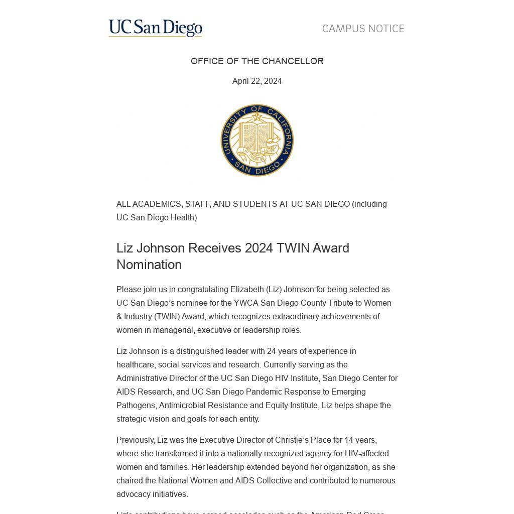 Please join us in congratulating Elizabeth (Liz) Johnson for being selected as UC San Diego’s nominee for the YWCA San Diego County Tribute to Women & Industry (TWIN) Award, which recognizes extraordinary achievements of women in managerial, executive or leadership roles.