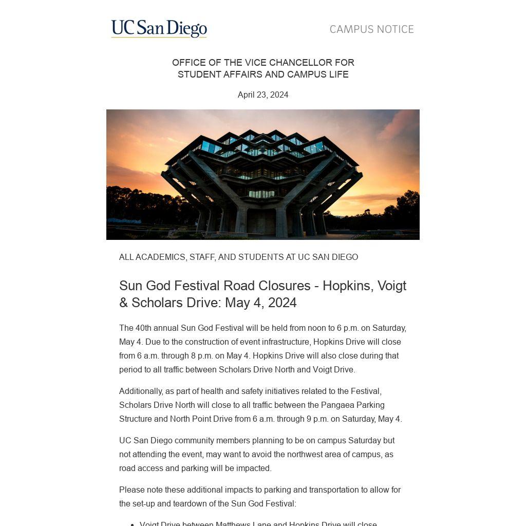 The 40th annual Sun God Festival will be held from noon to 6 p.m. on Saturday, May 4. Due to the construction of event infrastructure, Hopkins Drive will close from 6 a.m. through 8 p.m. on May 4. Hopkins Drive will also close during that period to all traffic between Scholars Drive North and Voigt Drive.