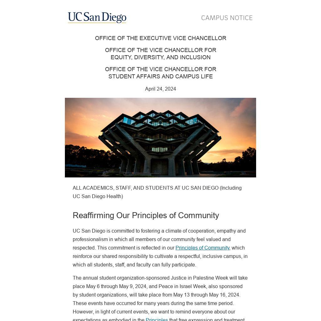 The annual student organization-sponsored Justice in Palestine Week will take place May 6 through May 9, 2024, and Peace in Israel Week, also sponsored by student organizations, will take place from May 13 through May 16, 2024. These events have occurred for many years during the same time period. However, in light of current events, we want to remind everyone about our expectations as embodied in the Principles that free expression and treatment of one another are to be conducted within the bounds of courtesy and physical safety, and honoring the inherent dignity within one another. We must remain mindful of the impact our words and actions have on our fellow Tritons.