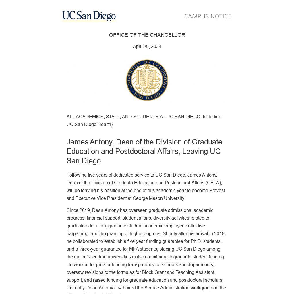 We hope you will join us in congratulating Dean Antony on his new role, and thank him for his leadership and significant impact on graduate education and postdoctoral affairs at UC San Diego. An announcement regarding an interim dean is forthcoming and a search for a new dean of Graduate Education and Postdoctoral Affairs will take place in the fall.