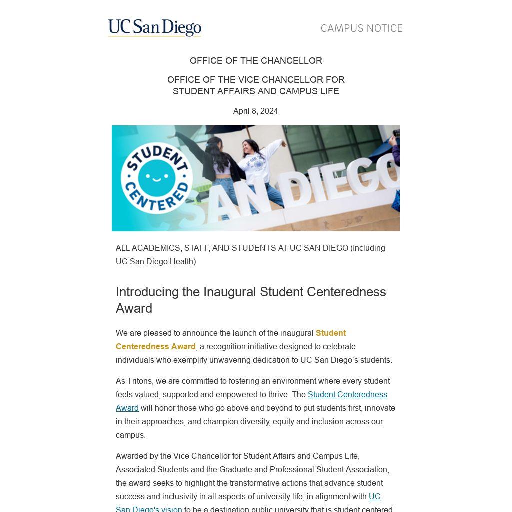 Stay tuned for more details on how to submit nominations and join us in celebrating the outstanding efforts of our Triton community members. In the meantime, please visit the Student Centeredness Award website for more information.