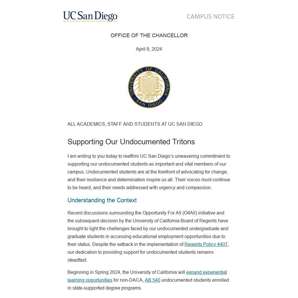 I am writing to you today to reaffirm UC San Diego’s unwavering commitment to supporting our undocumented students as important and vital members of our campus. Undocumented students are at the forefront of advocating for change, and their resilience and determination inspire us all. Their voices must continue to be heard, and their needs addressed with urgency and compassion.