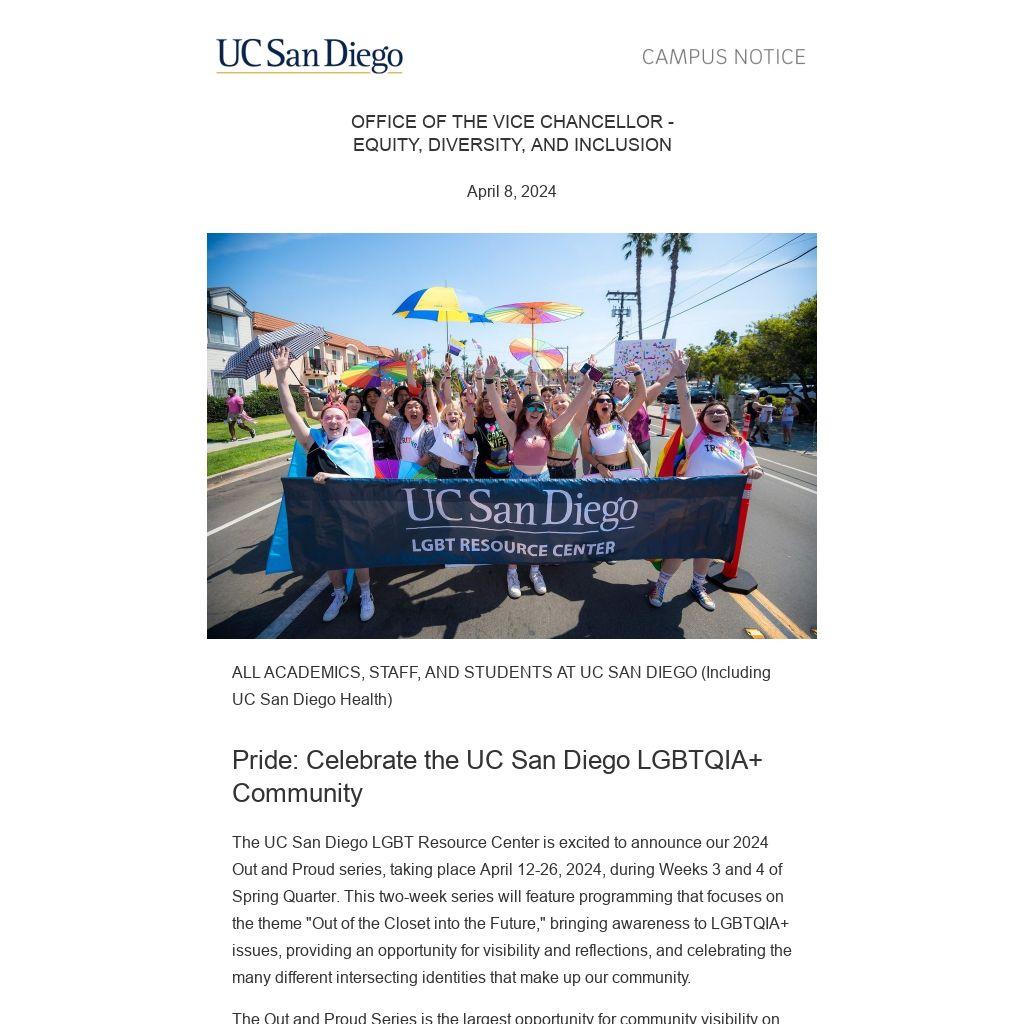 The UC San Diego LGBT Resource Center is excited to announce our 2024 Out and Proud series, taking place April 12-26, 2024, during Weeks 3 and 4 of Spring Quarter. This two-week series will feature programming that focuses on the theme "Out of the Closet into the Future," bringing awareness to LGBTQIA+ issues, providing an opportunity for visibility and reflections, and celebrating the many different intersecting identities that make up our community.