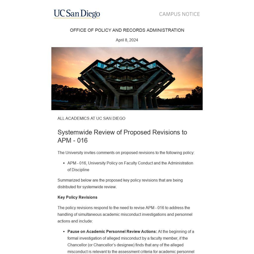 The draft policy is posted here. If you have any questions or if you wish to comment, please contact Paula Johnson in Policy and Records Administration at policy@ucsd.edu no later than July 1, 2024.