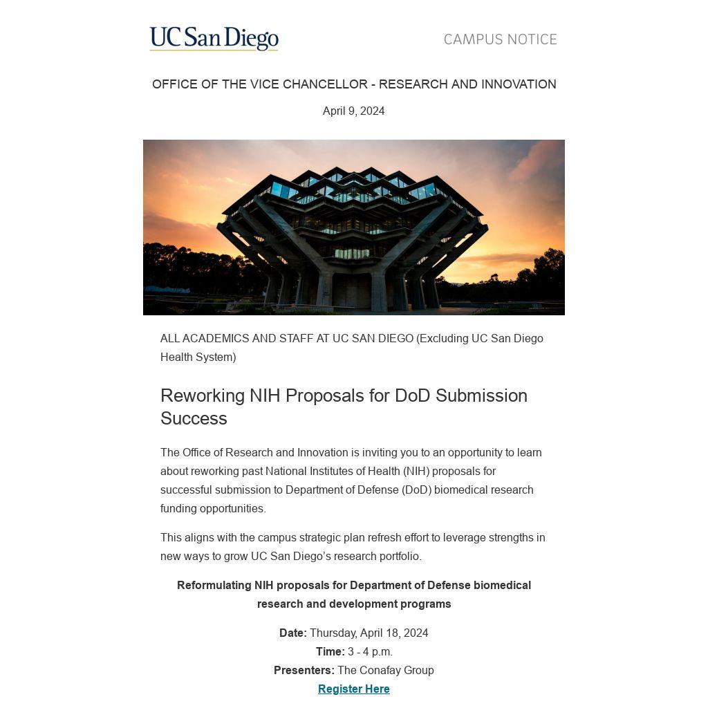 The Office of Research and Innovation is inviting you to an opportunity to learn about reworking past National Institutes of Health (NIH) proposals for successful submission to Department of Defense (DoD) biomedical research funding opportunities.