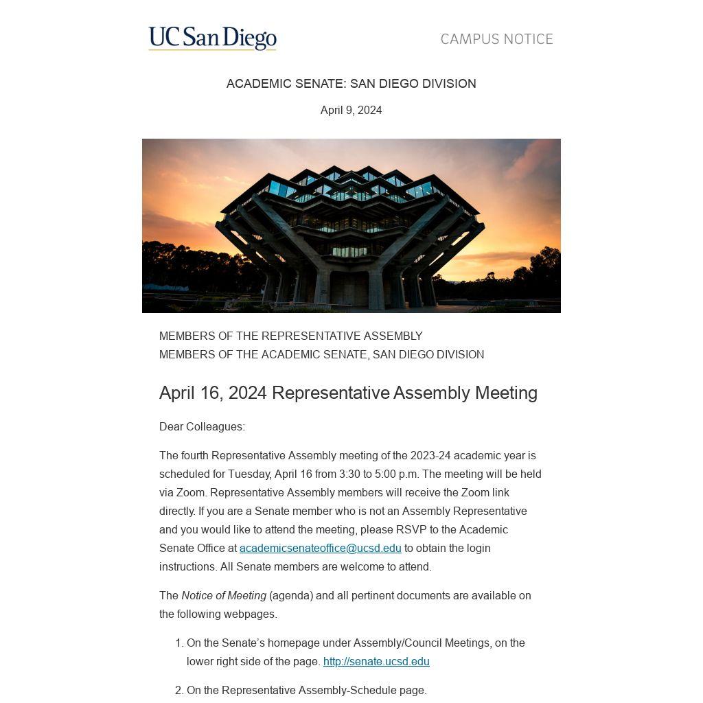 The fourth Representative Assembly meeting of the 2023-24 academic year is scheduled for Tuesday, April 16 from 3:30 to 5:00 p.m. The meeting will be held via Zoom. Representative Assembly members will receive the Zoom link directly. If you are a Senate member who is not an Assembly Representative and you would like to attend the meeting, please RSVP to the Academic Senate Office at academicsenateoffice@ucsd.edu to obtain the login instructions. All Senate members are welcome to attend.