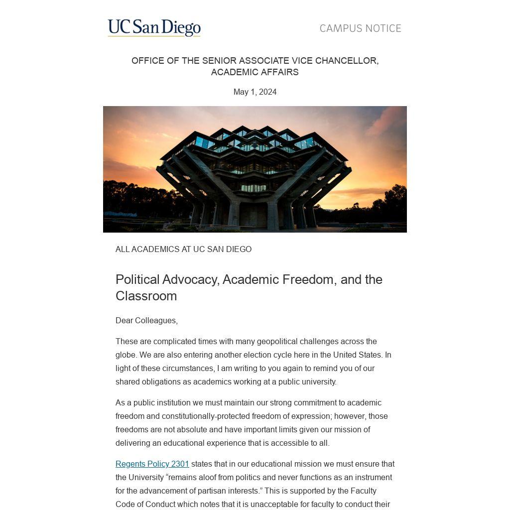 These are complicated times with many geopolitical challenges across the globe. We are also entering another election cycle here in the United States. In light of these circumstances, I am writing to you again to remind you of our shared obligations as academics working at a public university.